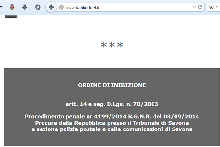 oggi 14 settembre 2014, accedendo al sito internet della soc. in questione, appare la dicitura: “ordine di inibizione, art. 14 d.lgs 70/2003, procedimento penale n. 4199/2014 RGNR (=Registro Generale Notizie di Reato) del 3.9.2014 Procura della Repubblica presso il tribunale di Savona…”