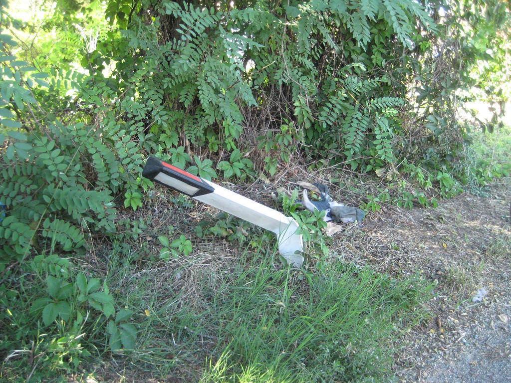 Però, dalle foto successive si potrà anche vedere come, a causa dell’erba eccessivamente alta, siano stati tagliati anche i paletti con catarifrangente che deliminatavano il tratto stradale.