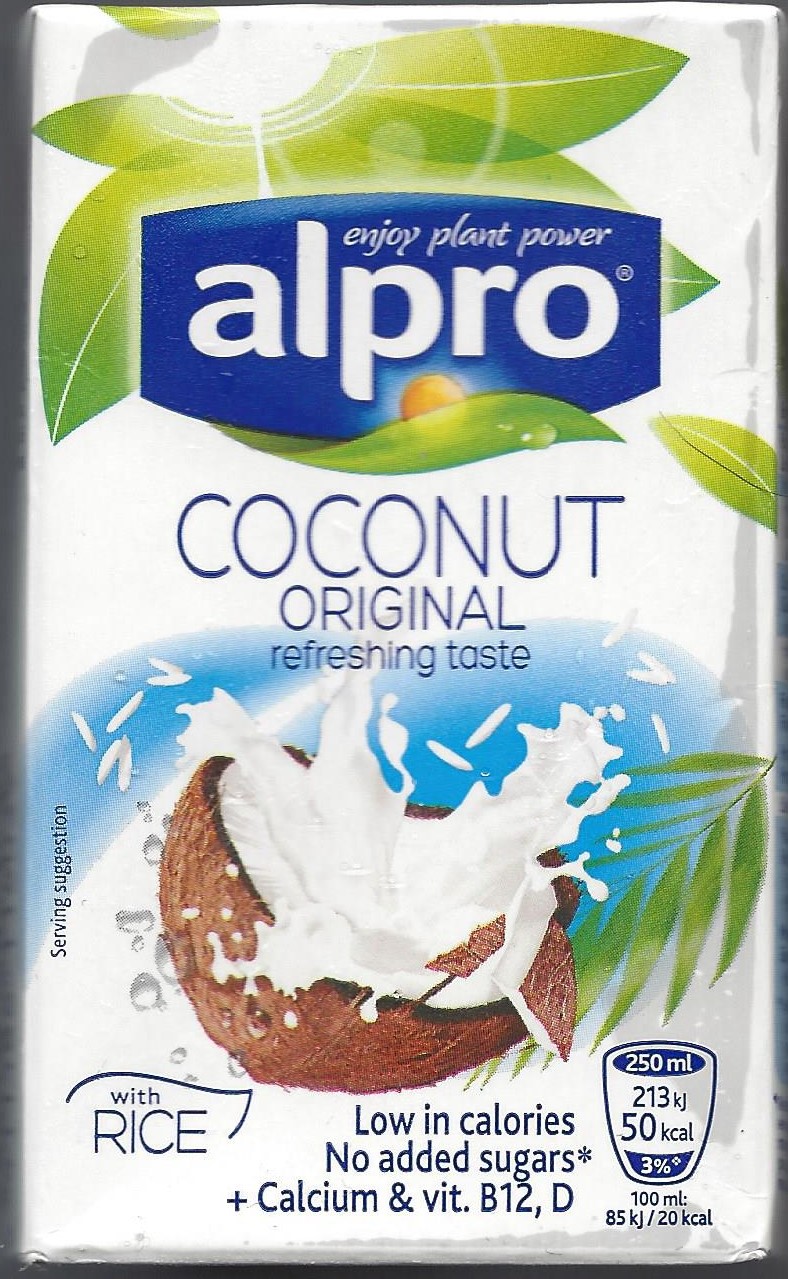 La scritta parla di Coconut, l’immagine ti fa vedere la noce di cocco ed il suo latte, poi più in basso c’è la scritta With rice (con riso) per cui sarebbe lecito aspettarsi che si tratti di latte di cocco con aggiunta di riso…