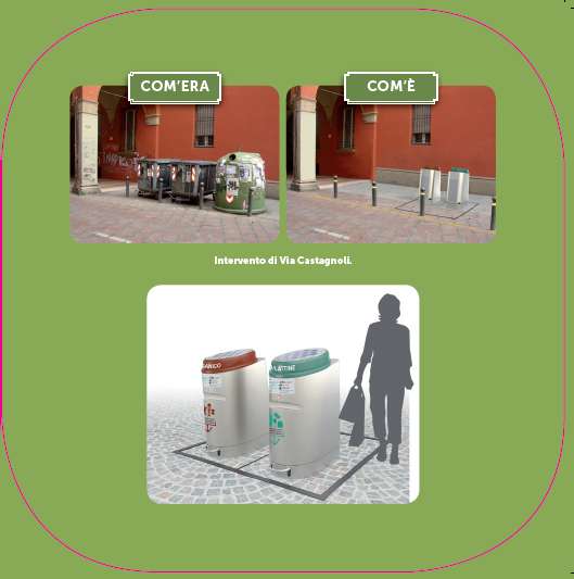Un progetto di riqualificazione ambientale, attento alle esigenze dei cittadini e alle funzionalità di servizio, che valorizzi le peculiarità architettoniche e culturali della città, doveva tenere conto dell’impatto con il contesto urbanistico (portici, musei, edifici storici, piazze) ma anche della viabilità e degli spazi interni e stradali, spesso esigui, come pure degli orari di raccolta, della sicurezza e dell’igiene.