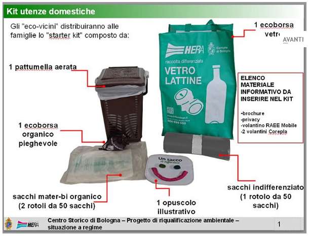 Dal 22 settembre gli “Ecovicini”, muniti di tesserino di riconoscimento, consegneranno a tutte le famiglie uno “starter kit” composto da: il depliant informativo, 1 pattumella areata per l’organico, 2 rotoli da 50 sacchi in mater-bi, 1 rotolo di sacchi neri per la raccolta per l’indifferenziato da 50 pezzi, una “ecoborsa” in plastica pesante verde per portare le bottiglie ed una “ecoborsina” ripiegabile per portare il sacchetto dell’organico.