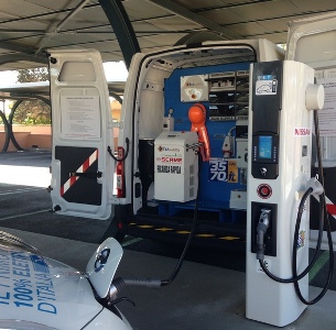 Presentata in esclusiva a Roma, in occasione dell’evento congiunto Nissan/URI, l’unità mobile per la ricarica rapida di FCS Mobility, 100 kW a bordo di un Nissan NV400 in grado di ricaricare un’auto completamente in riserva in poco meno di 30 minuti. I minuti si riducono addirittura a 15 se la batteria dell’e-car deve passare solo dal 30 all’80%.