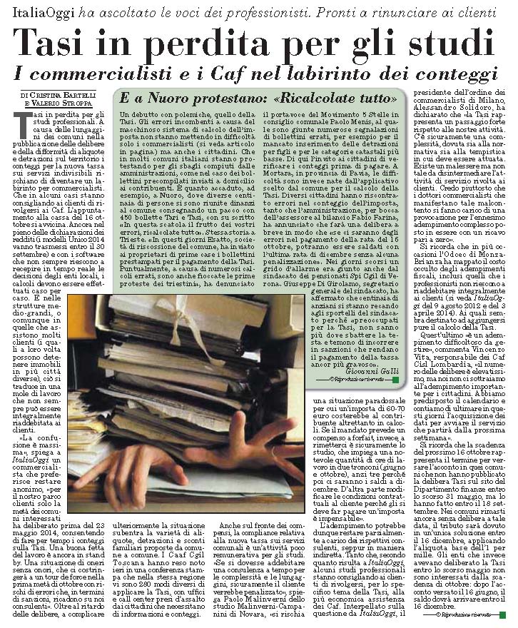 Tra l’altro “Sole 24 ore” (software del gestionale delle dichiarazioni) chiede un supplemento per il calcolo della Tasi, ergo pagano di più anche i professionisti. Per quanto concerne la Tasi sulle abitazioni in locazione il 10% è a carico dell’inquilino. P.S. intanto lavoriamo anche di notte.