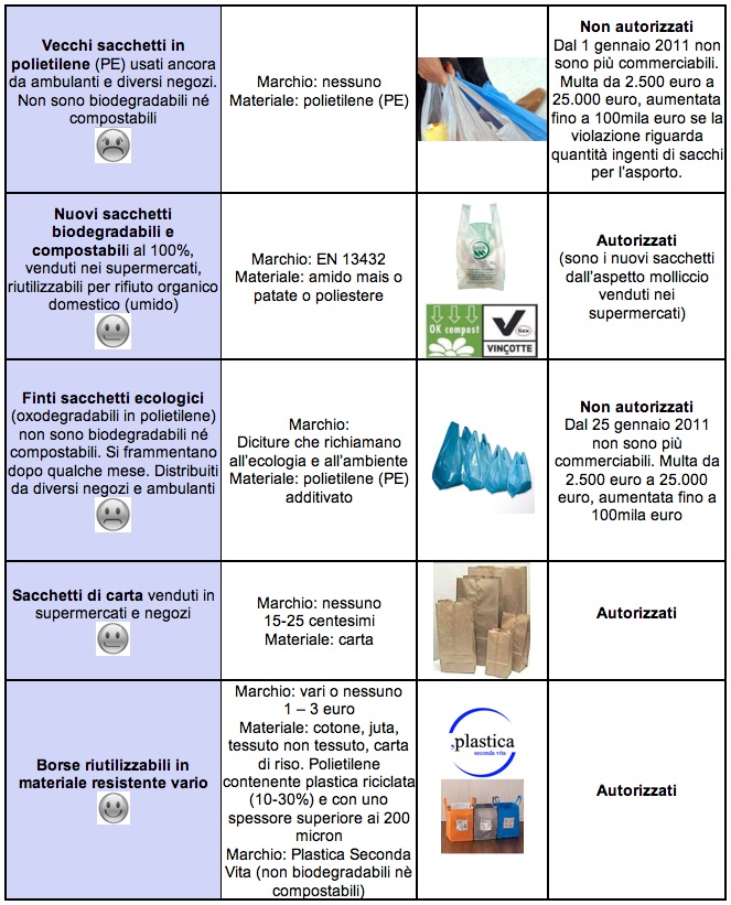 Suggerisco la lettura integrale dell’articolo, ma pubblico la tabella con i simboli dei sacchetti autorizzati e non in modo da poter fare le verifiche del caso.