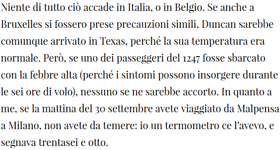 Vien da pensare che se si riuscisse ad applicare una rigida maglia di controlli, abbinata ad un perido di quarantena per i casi sospetti, sarebbe possibile contenere la diffusione; infatti leggevo poi che questa capacità di trasmissione limitata è uno dei motivi principali per cui le epidemie di ebola possono spesso essere arrestate nel giro di settimane o mesi.