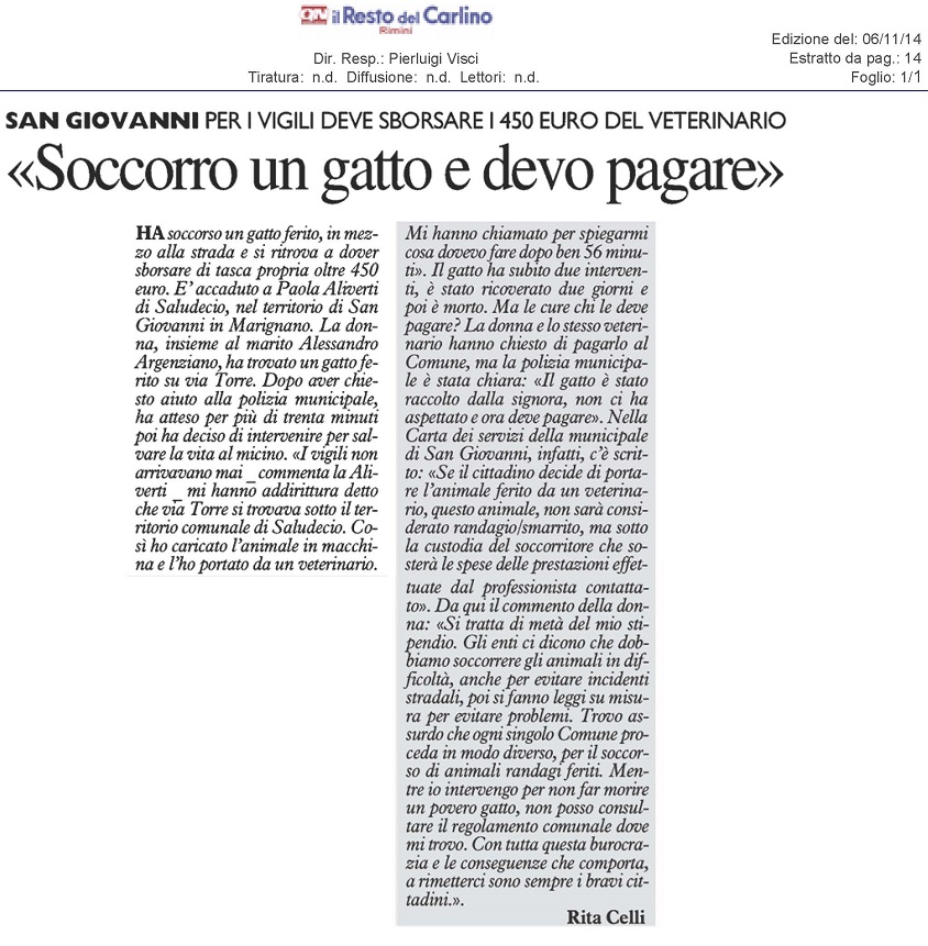 Ed infatti quasi due anni dopo il post citato in apertura, ecco arrivare la segnalazione di Chiara (che ringrazio) che cita un articolo letto sul Resto del Carlino, dalla quale si evinche il Comune gioca sul fatto che il gatto randagio non sia tale se il cittadino lo porta al Pronto Soccorso senza attendere l’intervento dei vigili che, peraltro, non arrivavano.
