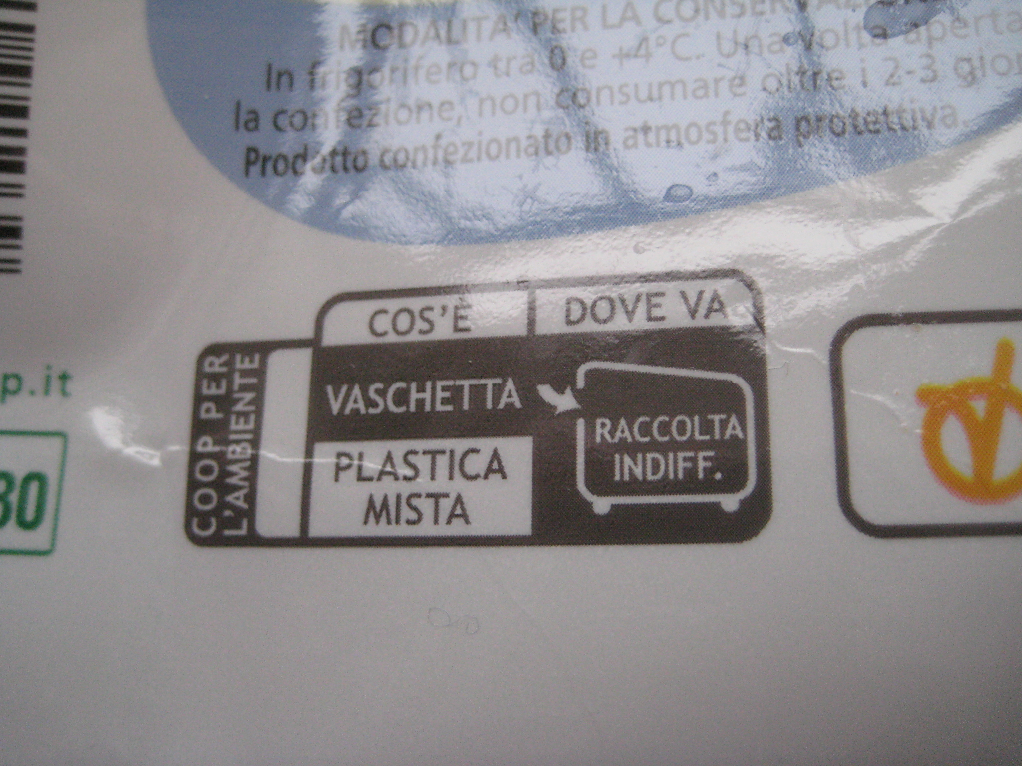 Guardo le indicazioni dei salumi Coop. Che cos’è? Plastica mista. Dove va? Raccolta indifferenziata.