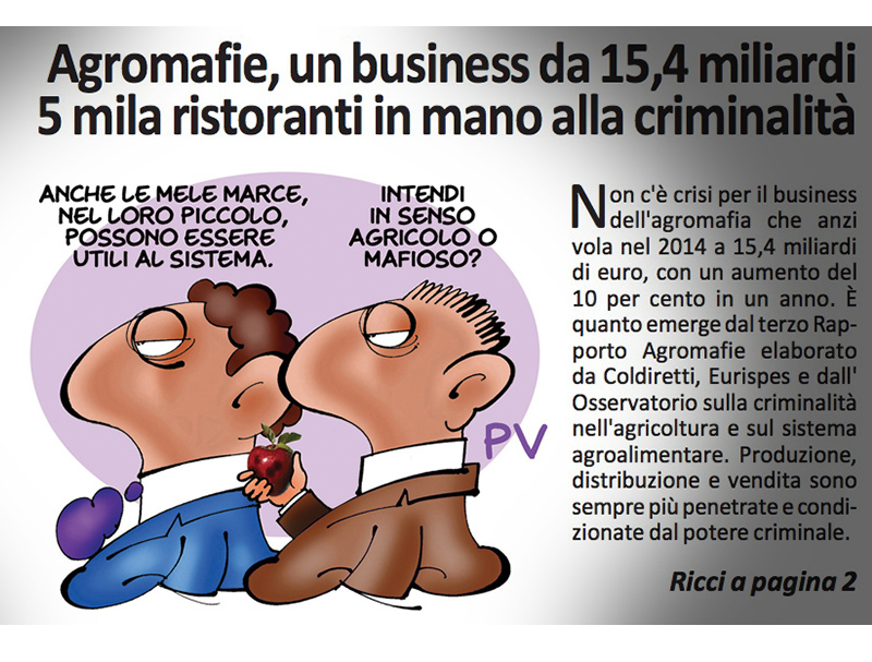 Lo dice il terzo Rapporto Nazionale Agromafie 2015 elaborato da Coldiretti, Eurispes e Osservatorio sulla criminalità che parla di un business (nel solo 2014) pari a 15,4 miliardi di euro, con un aumento del 10% rispetto all’anno precedente.