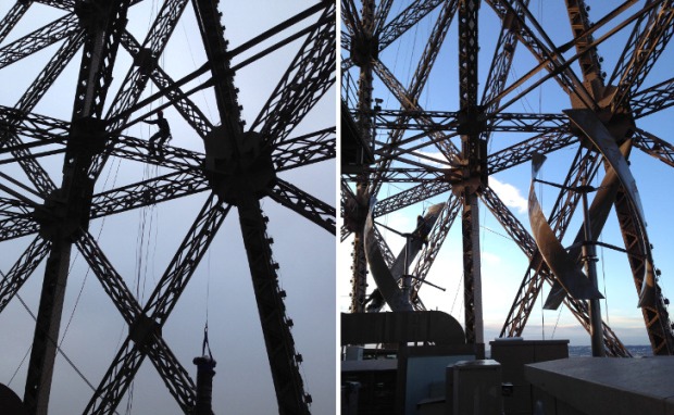 In collaborazione con la Société d’Exploitation de la Tour Eiffel (SETE), la società americana UGE International, ha installato due piccole turbine ad asse verticale sopra al secondo livello della struttura, ovvero ad oltre 120 metri dal suolo.