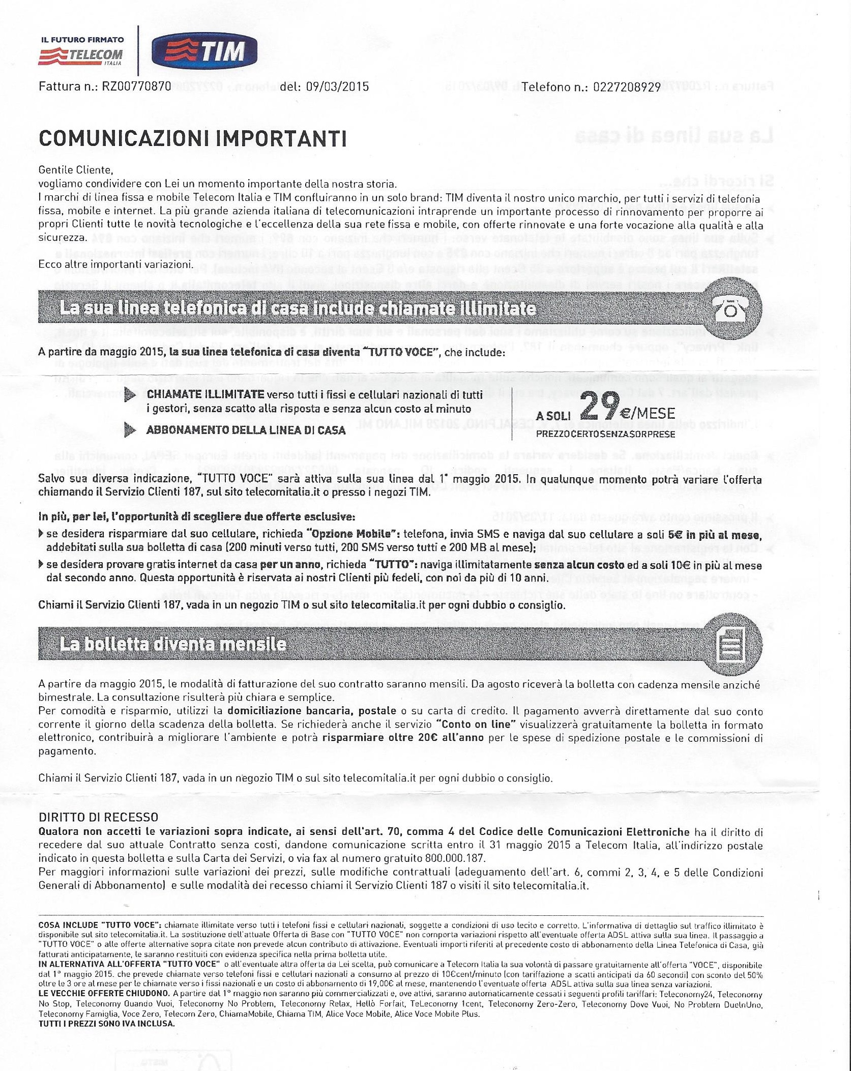 Per i clienti che ora hanno un piano che non prevede anche internet verrà attivata in automatico l’offerta “Tutto Voce”, al costo mensile di 29 euro, mentre coloro che al momento hanno anche la connessione ADSL flat, si passerà al piano tariffario “Tutto”.