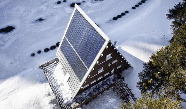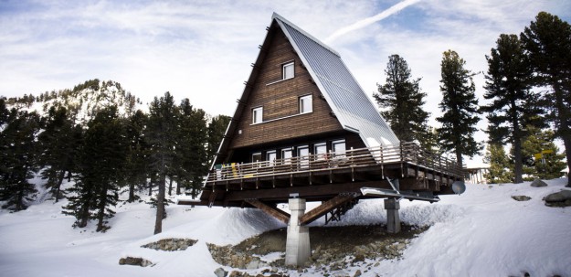 Un’architettura sognante ed aerea, sollevata dal suolo e protesa verso il cielo nella tipica conformazione a triangolo, fa capolino tra le vette appuntite, strizzando l’occhio alle casette Walser di cui ricalca le forme.