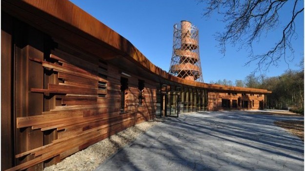 L’edificio sostenibile completamente realizzato in legno e vetro è affiancato da una torretta di controllo circolare, alla quale si accede tramite una scala a chiocciola per osservare dall’alto la splendida foresta di Assen.