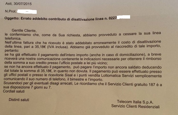 Nella foto puoi vedere l’ultima comunicazione ricevuta da Il Testimone in merito a quanto raccontato nel post Telecom dice che hai diritto al recesso gratuito ed infatti arriva l’addebito di 35 €