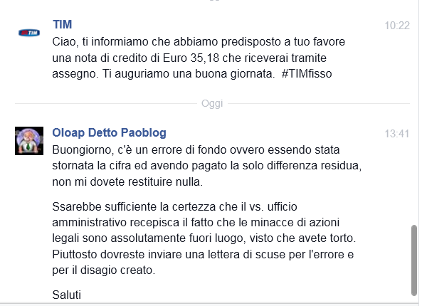 Dopo il martellamento degli ultimi giorni (leggi il post #TIMfisso insiste ancora con la richiesta di soldi non dovuti. Ma “ci sono o ci fanno”? e correlati) oggi ennesima comunicazione da #TIMfisso che sembra aver capito che non mio padre non gli deve 1 cent, anche se ancora non hanno ben realizzato che non avendo pagato la somma non dovuta, non chiede nessun rimborso, ma solo che la cessino con le minacce di azioni legali.
