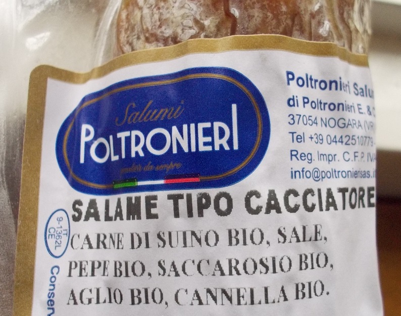 Fra i conservanti, ci sono nitrati e nitriti che a quanto pare sono indispensabili, ma ogni tanto trovo dei salumi che non li contengono, come Joselito, il salame senza nitrito e come il cacciatorino bio della Poltronieri Salumi che ho acquistato alcune settimane fa e che mi ha ispirato questo post:
