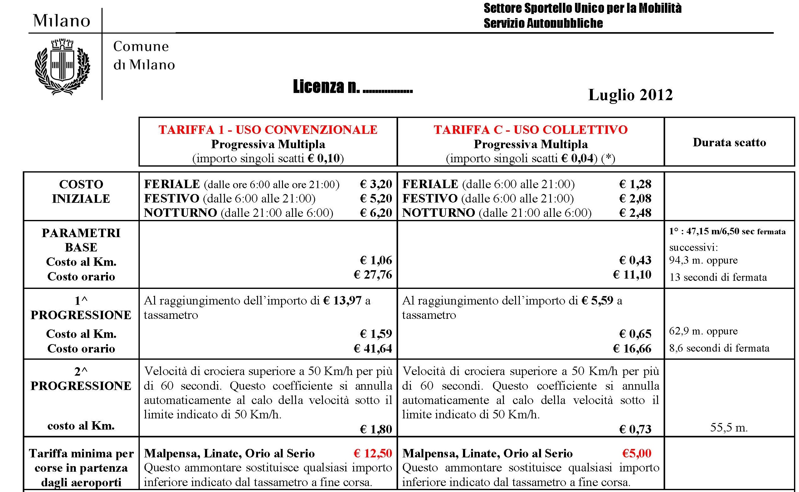 I parametri base della tariffa sono di € 1,03 al km. e di € 26,86 all’ora.