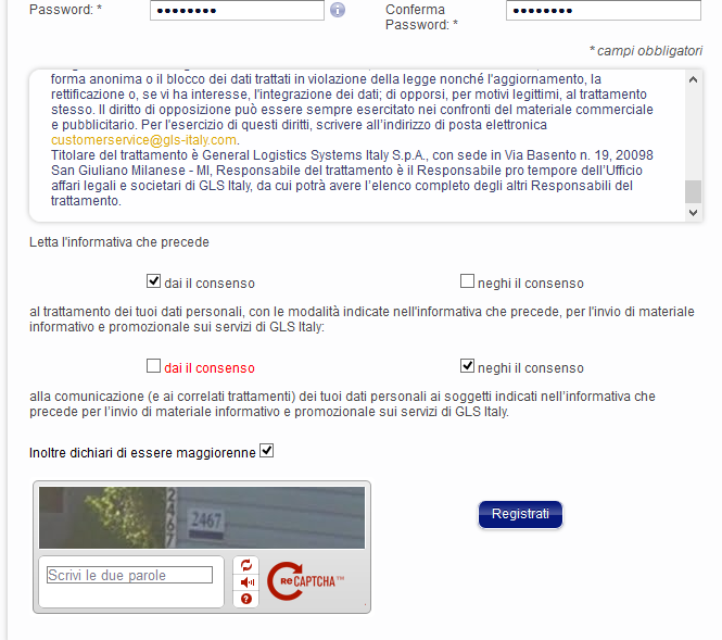 Alcuni giorni fa volevo registrarmi sul sito di GLS in modo da poter gestire al meglio le spedizioni per conto dei clienti, se non fosse che quando si arriva alla sezione dedicata al consenso al trattamento dei dati, ecco che se nego il consenso al trattamento dei dati per invio di materiale informativo e promozionale di GLS, non si riesce a concludere la registrazione.