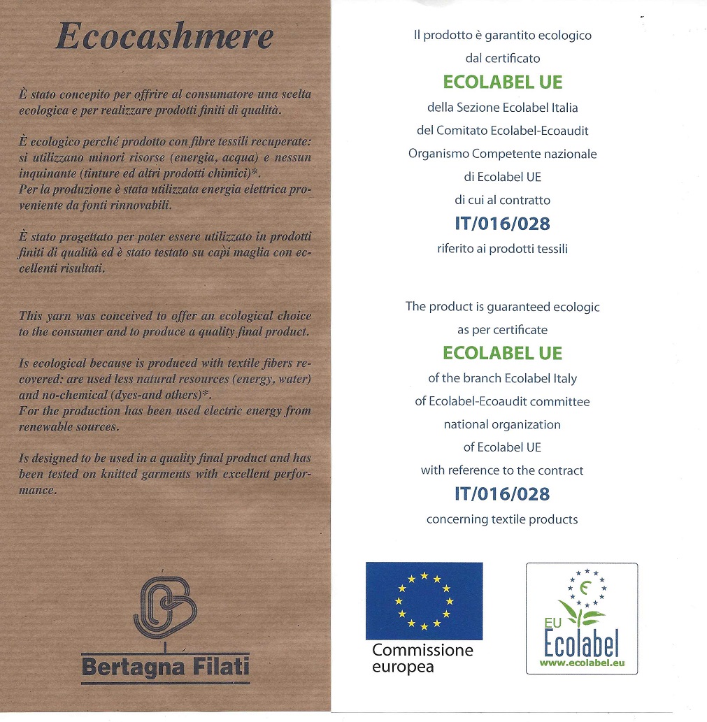 Le ho chiesto qualche informazione sui gomitoli e mi ha spiegato che si trattava di gomitoli (98% cashmere – 2% lana) ottenuti con il recupero di fibre tessili, come spiega il foglietto accluso alla confezione, integrato dal certificato Ecolabel.