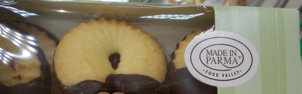 Ecco dei biscotti con cioccolato, Le lunette, imballate in una scatolina che sembra cartone (ma non è, leggi: Esselunga questa volta non mi aiuta a creare meno rifiuti…) ed in evidenza il marchio Made in Parma – food valley (#dilloinitaliano: valle del cibo)