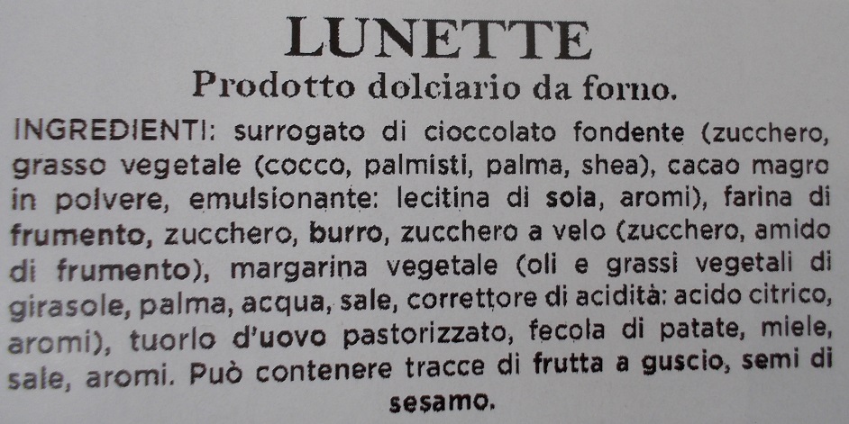 Probabilmente il fatto che l’ingrediente principale di queste lunette sia un surrogato di cioccolato fondente permette di farlo come si vuole, ma in ogni caso mi pare che la qualità non abiti qui.
