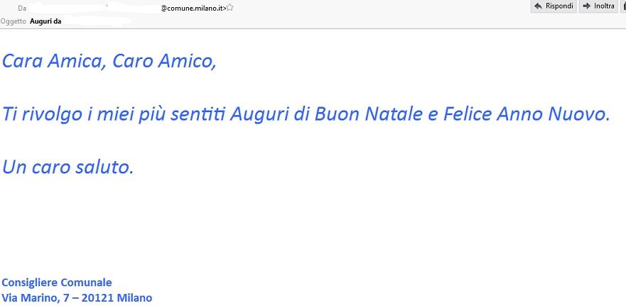 La mail di auguri di cui parlo l’ha ricevuta mio padre, ma il succo del discorso resta valido, dato che la mail inviata da questo consigliere comunale (che non citerò 😉 ) gronda ipocrisia e falsità a piene mani.