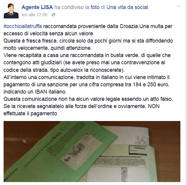 una notizia che leggo sulla Pagina FB dell’Agente Lisa