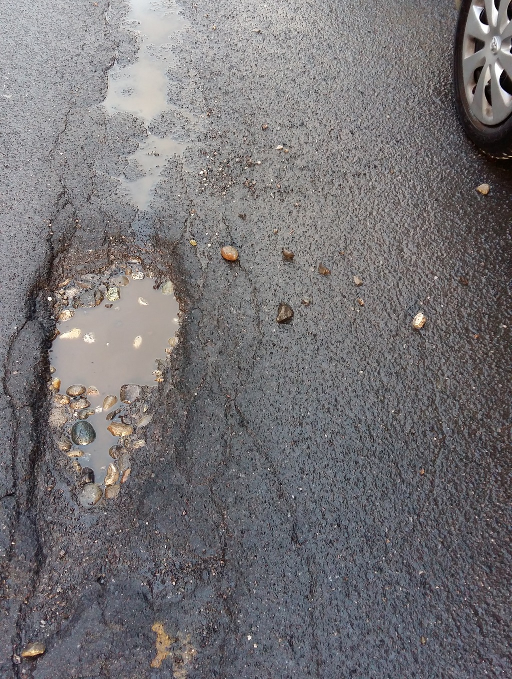 Successivamente ho segnalato, nella via adiacente, una buca che come potrete vedere è una fonte di ciottoli sollevati dalle auto di passaggio che talvolta vengono sparati sulle fiancate delle auto parcheggiate (sperando che qualcuno non parta verso un pedone).