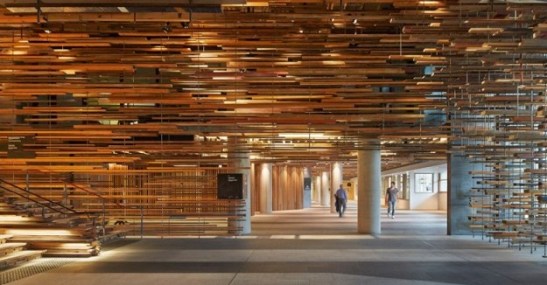 Questi elementi irregolari fluttuanti creano nella hall giochi di luce ed ombra davvero affascinanti, che ricordano quelli di un bosco in una giornata di sole.