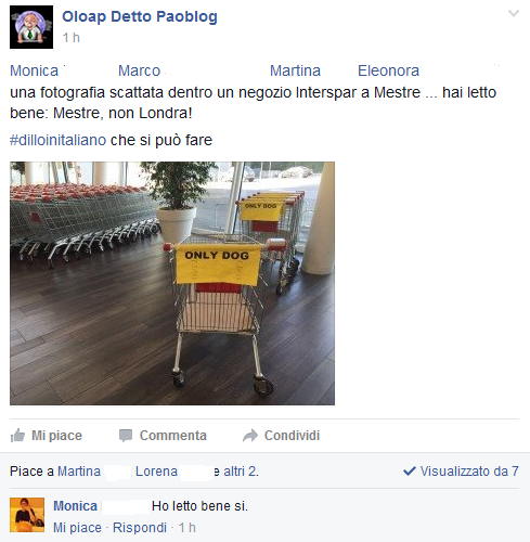 La aggiungo facendo notare che all’ingresso dei club privati si legge ‘Members Only’, e non ‘Only Members’. Quindi su quei carrelli andava scritto ‘Dogs Only’ (al plurale), non ‘Only Dog’.