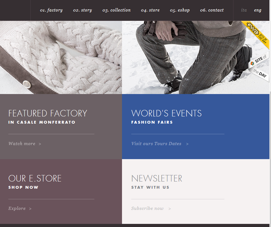 Ho quindi selezionato la lingua italiana (ita) e cambia tutto ovvero le voci nel menù in alto (Fabbrica, storia, ecc.) sono riportate in italiano, ma le sezioni Featured Factory – World’s events – Our E.Store – Newsletter restano invariate ovvero in inglese. A me pare un’assurdità…