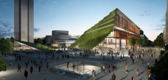 La soluzione adottata da Ingenhoven Architects prevede la costruzione di due nuovi edifici con tetti verdi inclinati asimmetricamente.