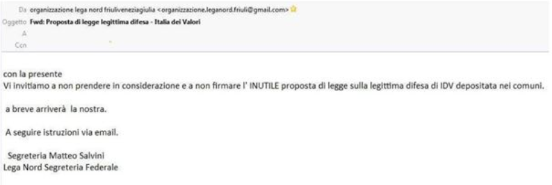 A prescindere dalle nostre opinioni, mi sono comunque informato meglio e sul sito di Italia dei Valori ho trovato una mail che la dice lunga sulla sincerità dei politici ovvero da un lato Salvini tuona a favore di chi spara ai ladri e dall’altro invita i suoi consiglieri a non firmare questa raccolta di firme.