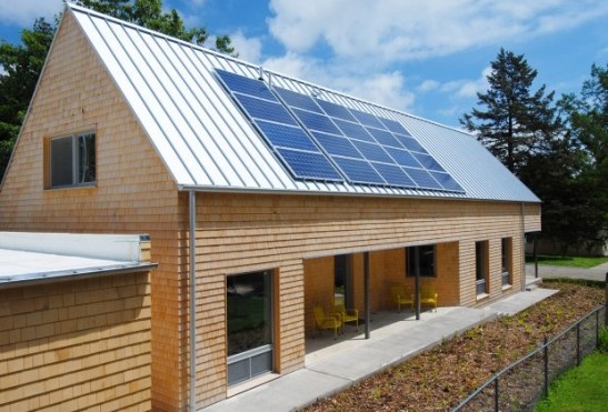 La casa passiva è alimentata da moduli fotovoltaici installati sul tetto, che rendono l’edificio a energia zero anche grazie a strategie di ventilazione a recupero di energia.
