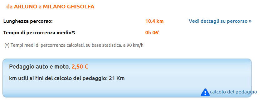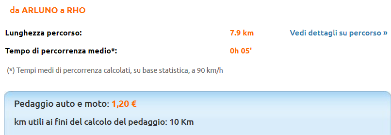 In calce potrai vedere le schermate tratte dal sito di Autostrade che confermano quel che dico, ma riassumo in una riga: Arluno > Milano Ghisolfa – km. 10,4 = € 2,50 / Arluno > Rho – km. 7,9 = € 1,20