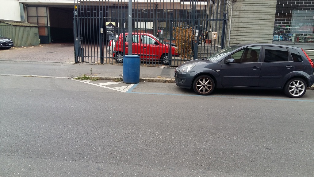 Nonostante le strisce blu siano tracciate ad una certa distanza dal cancello, per permettere la svolta dei mezzi, e vi siano delle misteriose strisce bianche in diagonale, ecco che quelli della rimessa sono stati costretti a posizionare dei bidoni blu per impedire che il solito furbo parcheggi nella zona vietata.