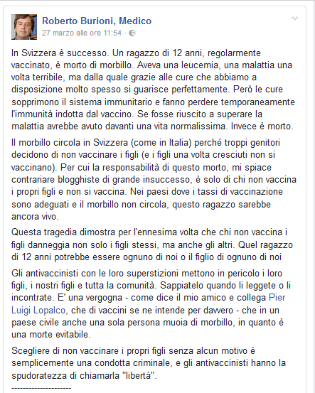 Tempo fa a Monza un bimbo di 18 mesi, affetto da leucemia linfoblastica, è morto a causa del morbillo. Se tutti si fossero vaccinati il virus non sarebbe stato in circolazione e lui avrebbe potuto combattere la malattia con notevoli probabilità di sconfiggerla». (Cit. Roberto Burioni – virologo)