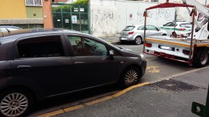 Ore 11.00 ecco i vigili. La multa purtroppo è poca cosa, 28 € se pagata entro 5 giorni, per cui non fa da deterrente, ma la rimozione (sui 90 €) ed il deposito dovrebbero farsi sentire…