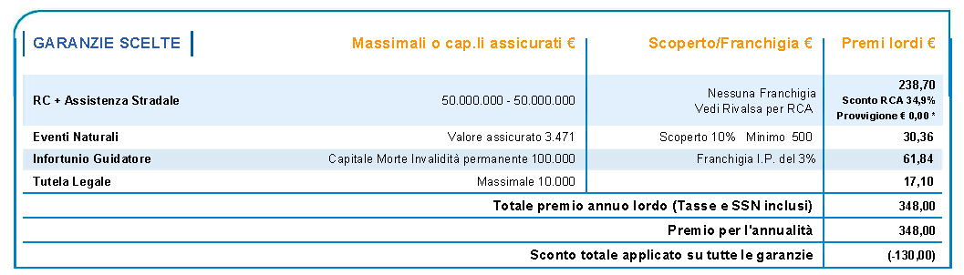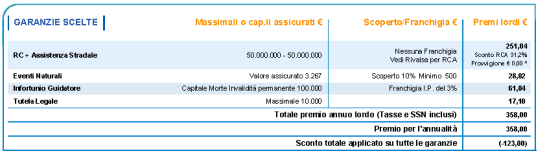 Consiglio fortemente di inserire il BONUS PROTETTO; garanzia Genialloyd (ma credo sia prevista anche da altre compagnie) che consente di annullare l’evoluzione in malus della classe di merito Genialloyd conseguente al pagamento di un sinistro con responsabilità principale o per cumulo di responsabilità.