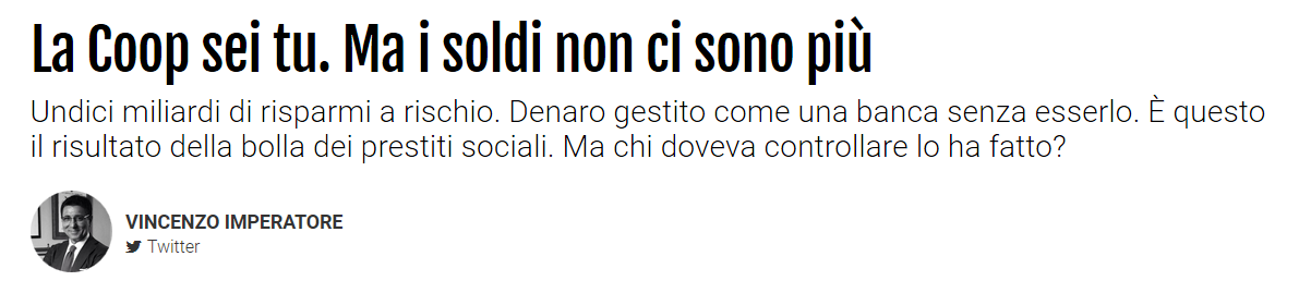 Negli ultimi mesi ho sentito alcune voci sul Libretto di Prestito Sociale della Coop, in merito ai rischi di veder sparire i soldi, ma mai nulla di così concreto da farmi alzare le antenne, anche perchè troppi quotidiani fanno politica piuttosto che informazione per cui non sempre sono affidabili, tuttavia nei giorni scorsi mi è capitato sott’occhio l’articolo di Vincenzo Imperatore scritto su Lettera43 del quale pubblico un assaggio.