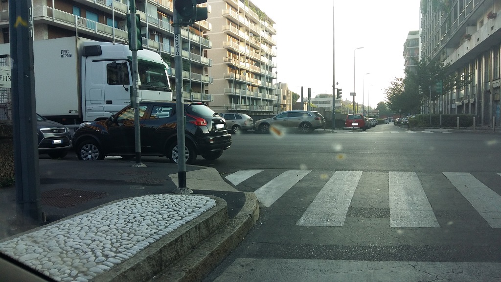 Ho rallentato in modo da potermi fermare al semaforo e scattare la foto. Le automobili che vedete parcheggiate, sono in divieto di sosta e già limitano la visibilità quando devi attraversare, immaginatevi poi con il grosso camion in doppia fila che vedo alemno 2 o 3 volte alla settimana.