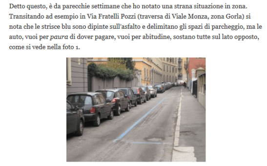 … se non fosse che riconosco la foto che è stata tratta da questo post pubblicato il 6 aprile 2011 dove parlavo di strisce blu inattive a Milano e modalità di parcheggio e nello specifico citavo la mail inviata al Comune: