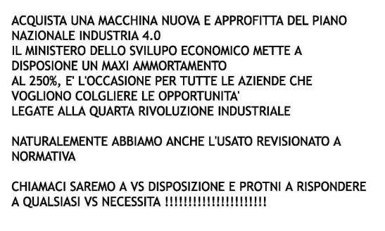 Ricevo in azienda una mail di un’azienda italiana che offre macchinari usati; fingo di tralasciare l’uso del tutto maiuscolo, l’abbondanza di punti esclamativi, la mancanza di punteggiatura ed una formattazione del testo che lascia a desiderare, ma il numero di errori trovati è veramente imbarazzante.