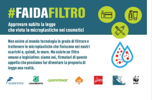 Per questo Marevivo, Legambiente, Greenpeace, Lav, Lipu, MedSharks e WWF, lanciano l’appello #Faidafiltro, per chiedere al presidente del Senato Pietro Grasso e a tutti i Senatori di approvare al più presto la proposta di legge per la messa al bando delle microplastiche nei cosmetici, già licenziata dalla Camera un anno fa.
