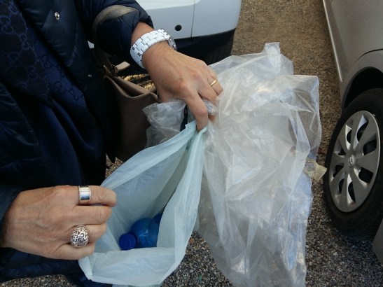 Rientrando a casa, in auto, Rok ha notato una bottiglia sul prato a bordo strada, per cui mi sono fermato ed è scesa a raccogliere un paio di bottiglie ed un altro rifiuto in plastica e successivamente in uno dei canali d’irrigazione vicino a casa ha notato un telo di plastica e questo è il bottino per 2 minuti di Impegno civile: