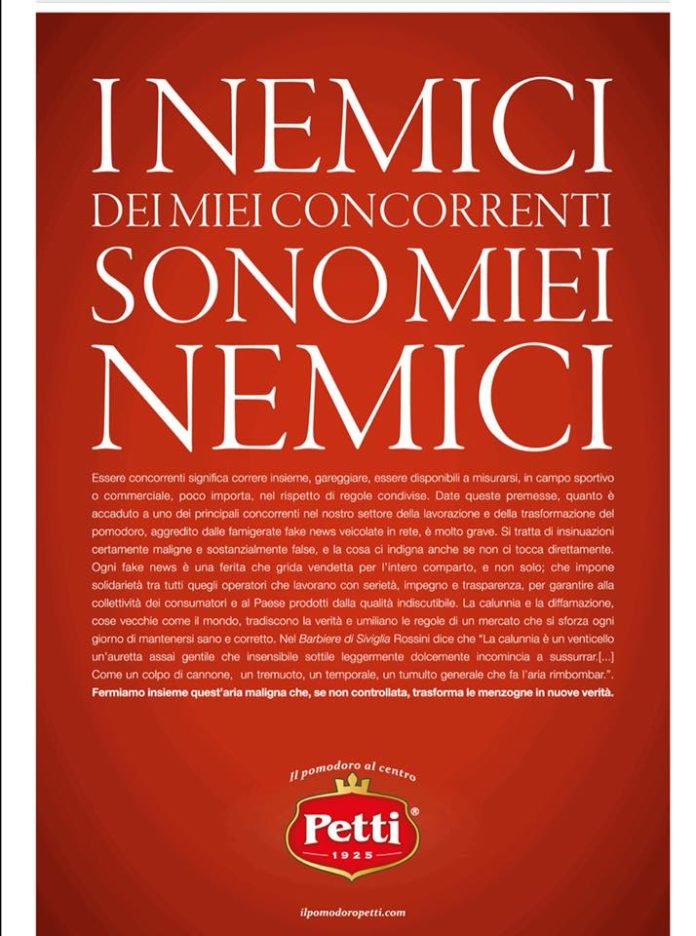 leggo sul Fatto Alimentare di questo messaggio che l’azienda Petti ha diffuso attraverso Il Corriere della Sera per difendere il suo diretto concorrente (Mutti). Complimenti.