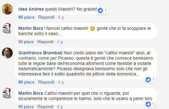 E’ anche vero che quando leggi che a Milano la Banca d’Italia terrà dei corsi gratuiti di educazione finanziaria, i primi commenti ricevuti sul Gruppo FB la dicono lunga sul sentire dei cittadini:
