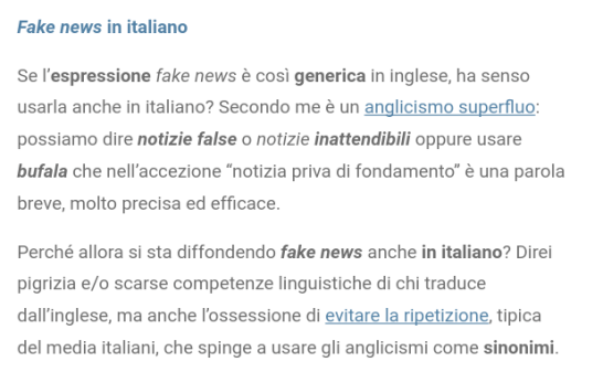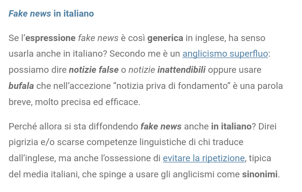 Commento non strettamente rilevante la parte terminologica del post: trovo stupefacente che si dedichino cosi’ tante energie ad un concetto tanto artefatto e strumentale. Da che mondo e’ mondo, le fake news le propone chi comanda. Pensare che la lotta alle fake news sia contro le fake news e’ la fake news piu’ grande di tutte.