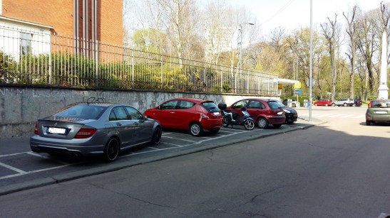 Quanta fatica inutile, eccola qui la soluzione perfetta: parcheggiare, meglio ancora se di traverso, sui parcheggi delle moto in via Boschetti.
