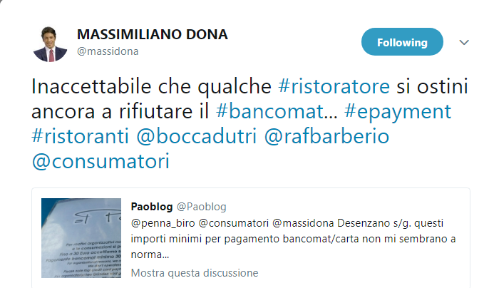 Aggiungo che non sono fra quelli che pretendono di pagare il caffè pagando con carta di credito (come ho visto fare), però può capitare di non avere con sè dei contanti ed imporre un limite di ben 50 € per il pagamento con carta di credito mi sembra ben più che una violazione della legge.