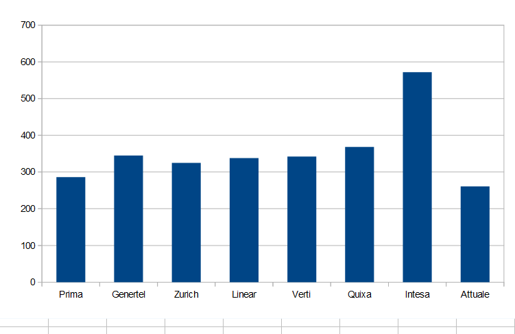 Premetto che i preventivi che riassumo nel grafico che segue fanno riferimento alla sola RCA e tutti con il massimale più alto possibile che, in ogni caso, è sempre inferiore al mio.